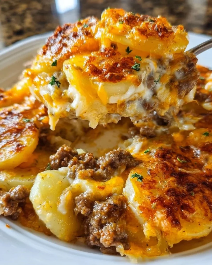 This Cheesy Hamburger Potato Casserole combines rich ground beef, tender potatoes, and a gooey cheese topping for a perfect comforting meal.