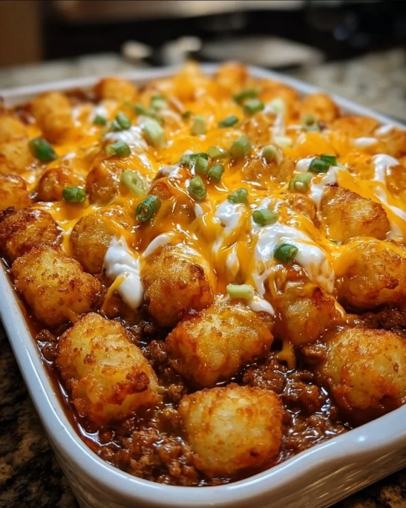 This Chili Cheese Tater Tot Casserole is a one-dish wonder that combines crispy tater tots, savory chili, and gooey cheddar cheese for a satisfying family meal.Ingredients