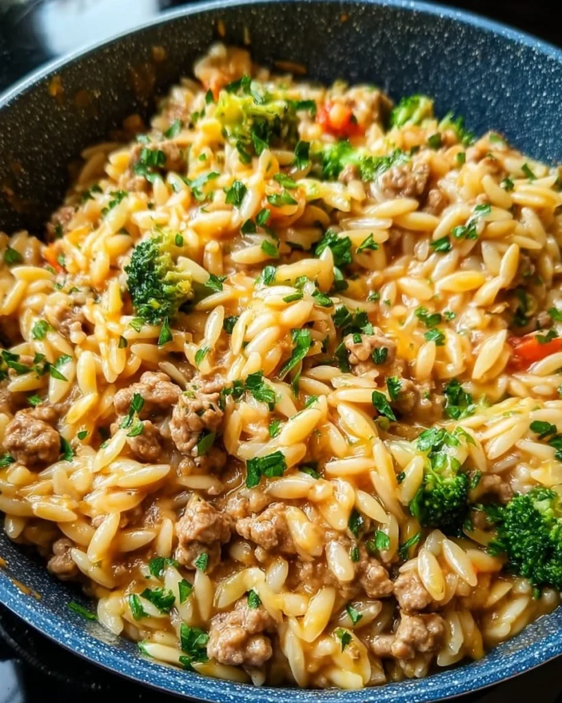 Enjoy a quick and nutritious One-Pot Ground Turkey Orzo that's perfect for busy weeknights. This dish combines lean ground turkey, tender orzo pasta, and vibrant veggies for a wholesome family meal.Ingredients
