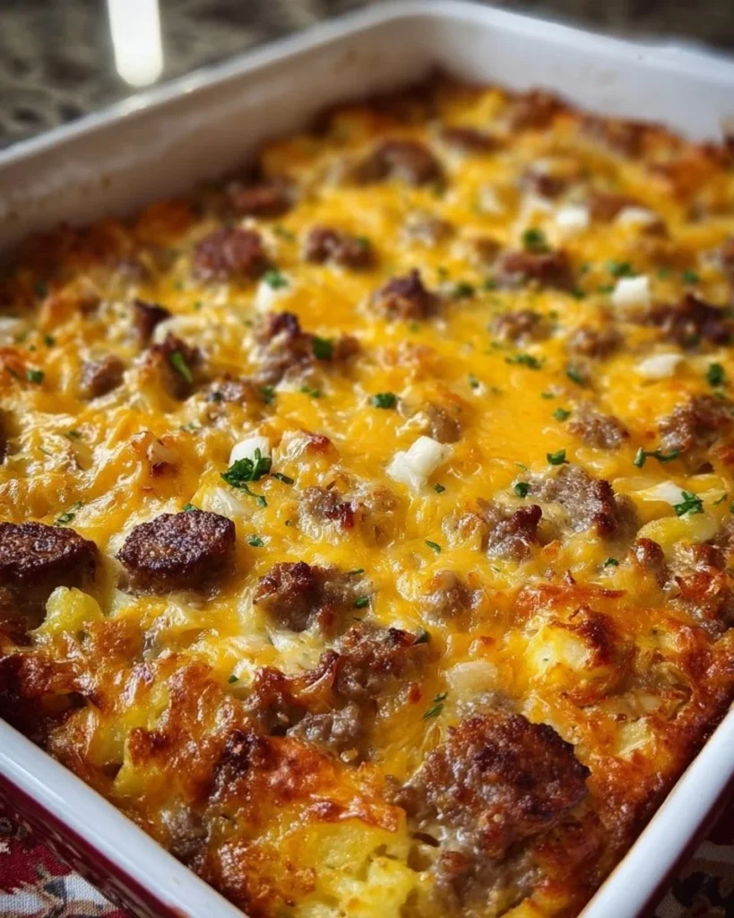Imagine a symphony of flavors waking you up each morning—a golden-brown crust that encases a hearty concoction of savory sausage, crispy hash browns, and melty cheddar. It’s like hugging your taste buds! This casserole is not just a meal; it’s a hug in a dish, offering warmth and comfort in every bite.